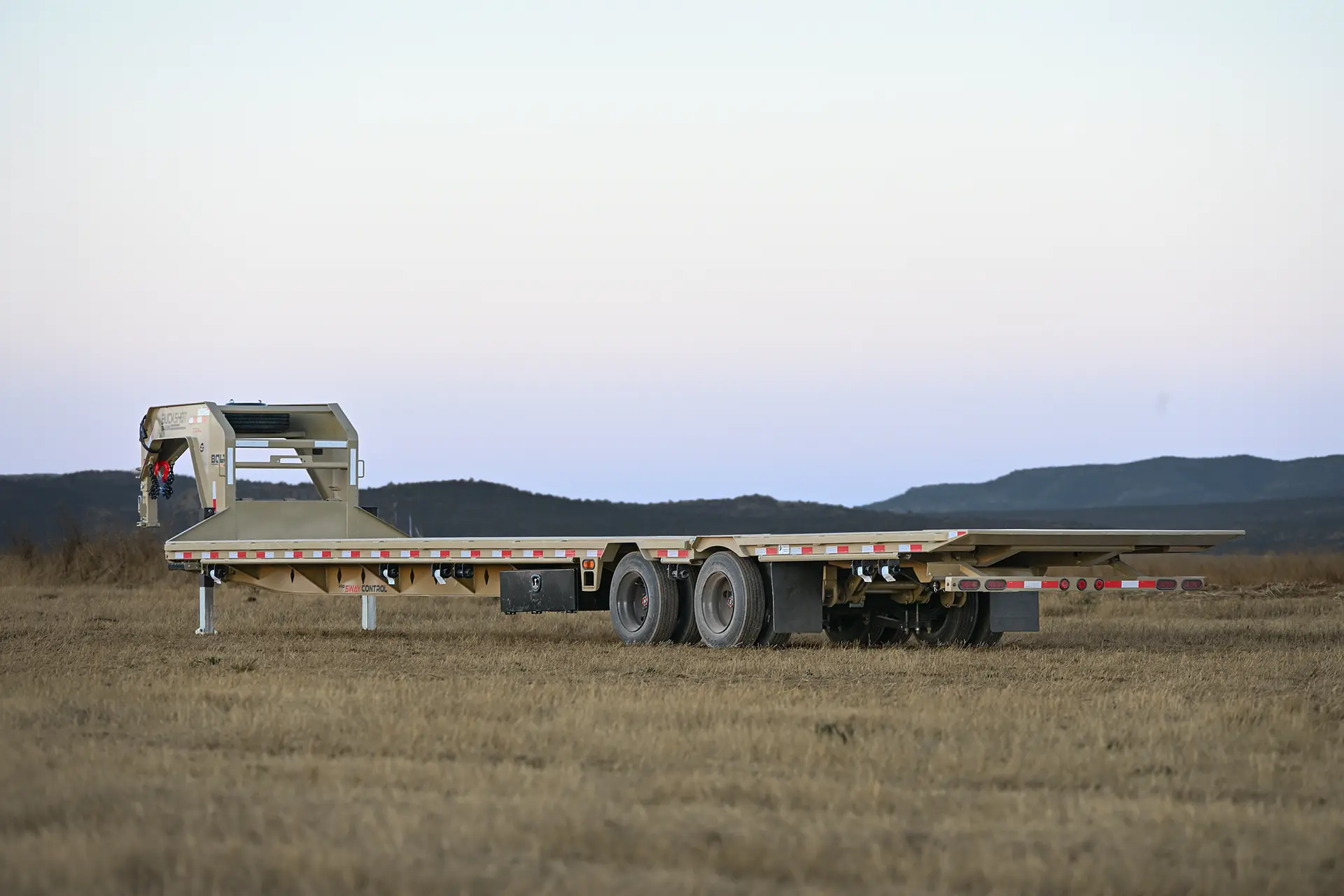 Versatility is enhanced with a Hydraulic Dovetail powered by dual 14” bore cylinders, combined with retractable steps, stake pockets, and pipe chain spools for maximum functionality. For secure transport, the trailer features a lockable Mega Toolbox, along with a 30,000 lb adjustable 2-5/16” coupler and dual 12,000 lb drop-leg jacks.